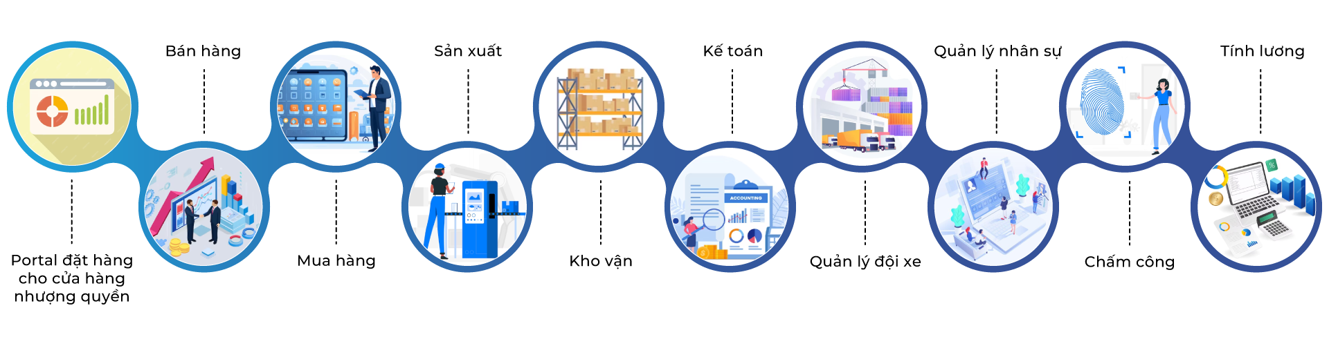 Thiết lập các chính sách đặt hàng cho nhượng quyền. Theo dõi trạng thái đơn hàng. Liên kết các module kế toán, kho hàng. Báo cáo doanh số, sản lượng, lợi nhuận theo danh mục sản phẩm/ sản phẩm, khách hàng, phân tích theo nhóm sản phẩm để đánh giá hiệu quả kinh doanh.